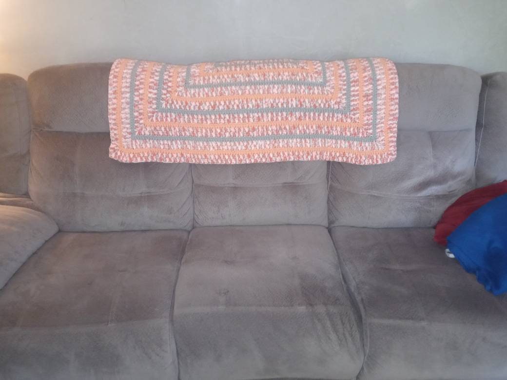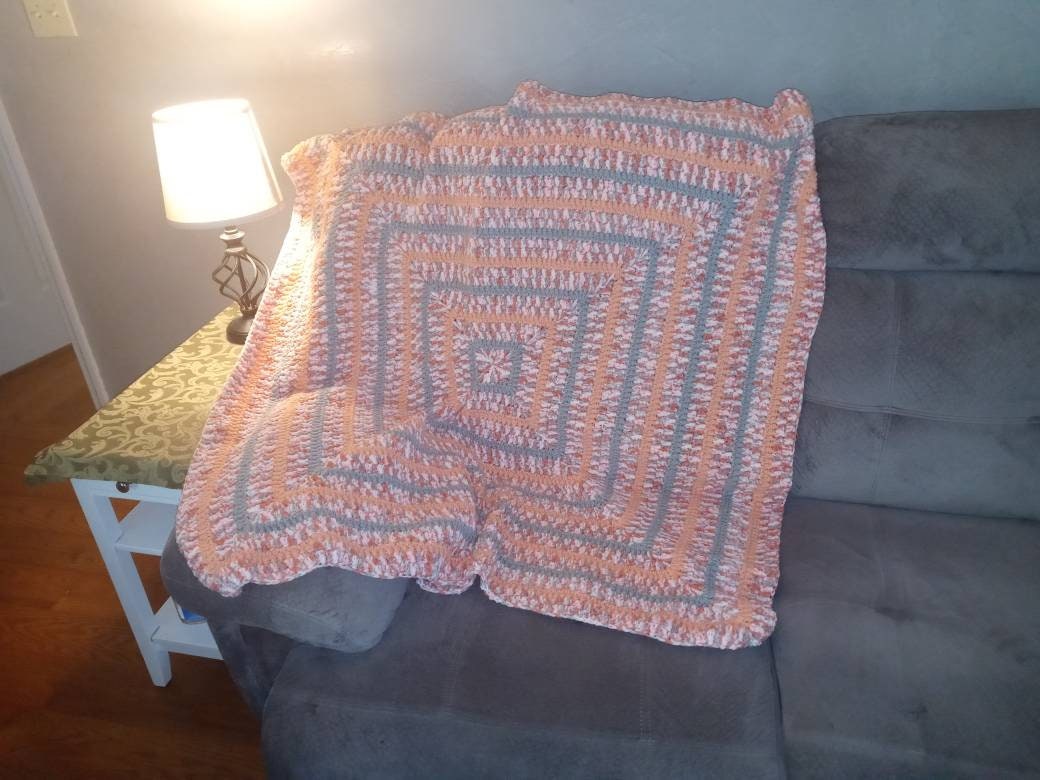This crochet baby spiral blanket feautres two rounds that are stitched in a pattern, giving balance to both solid color 1 and solid color 2.