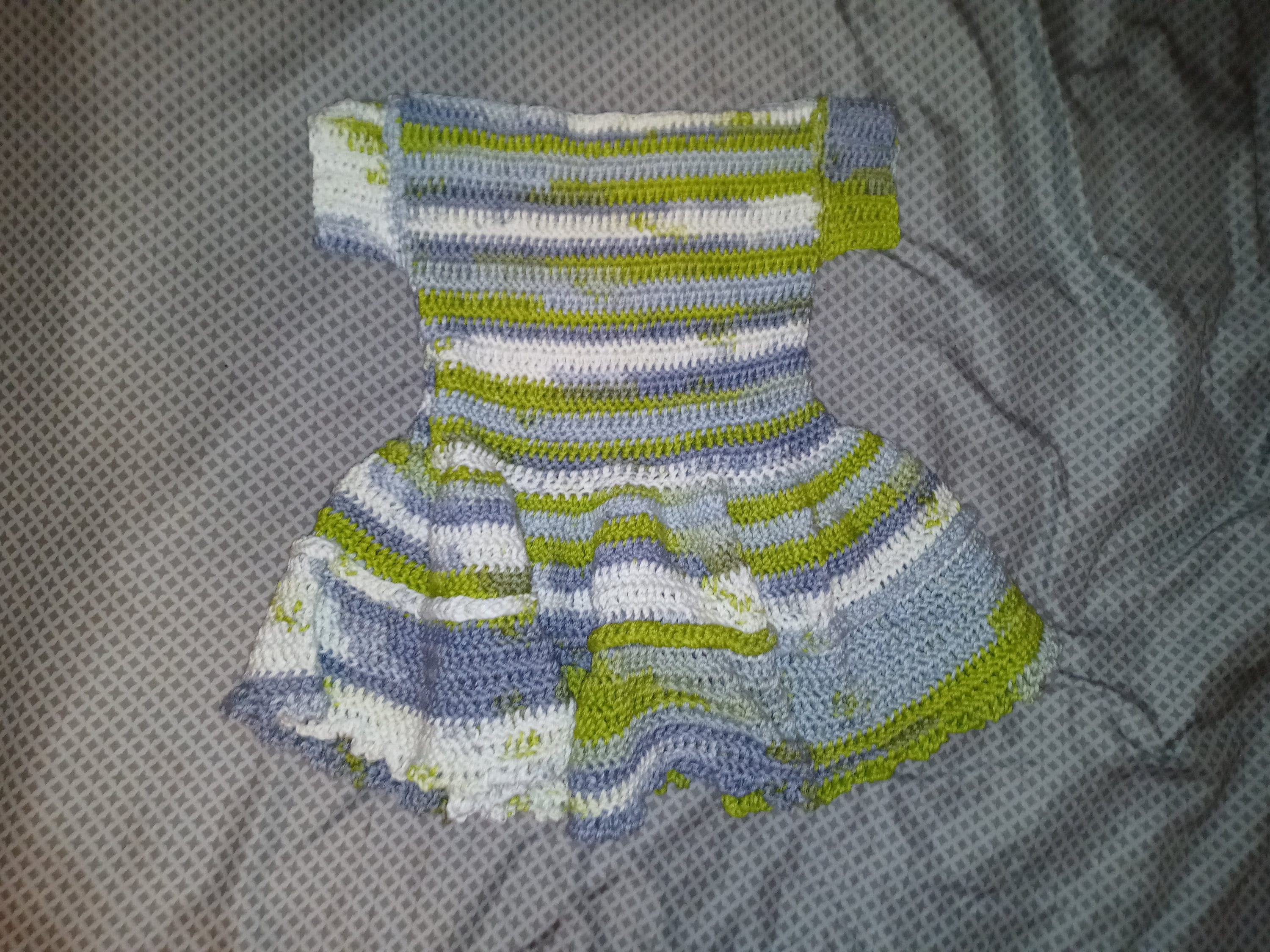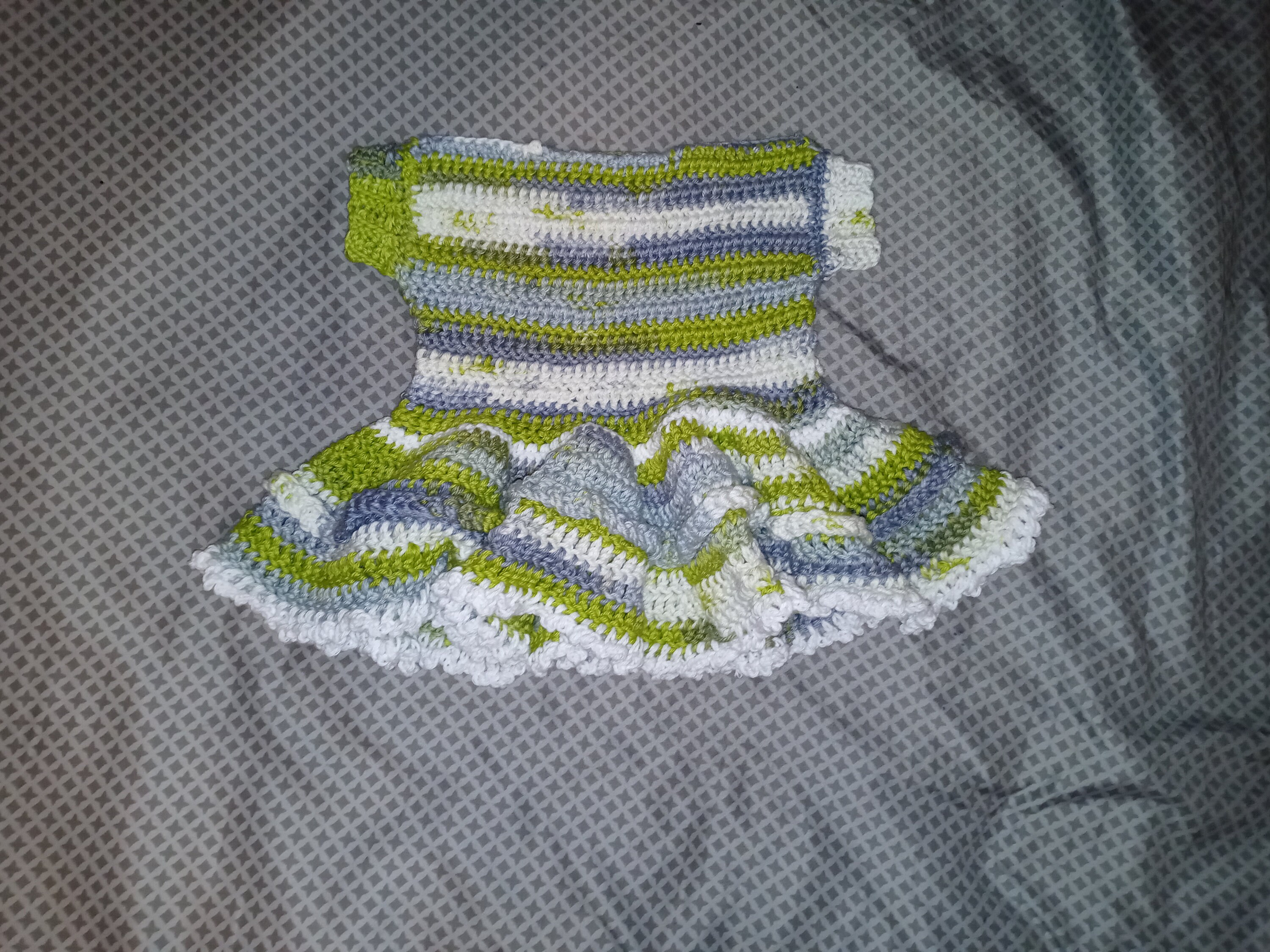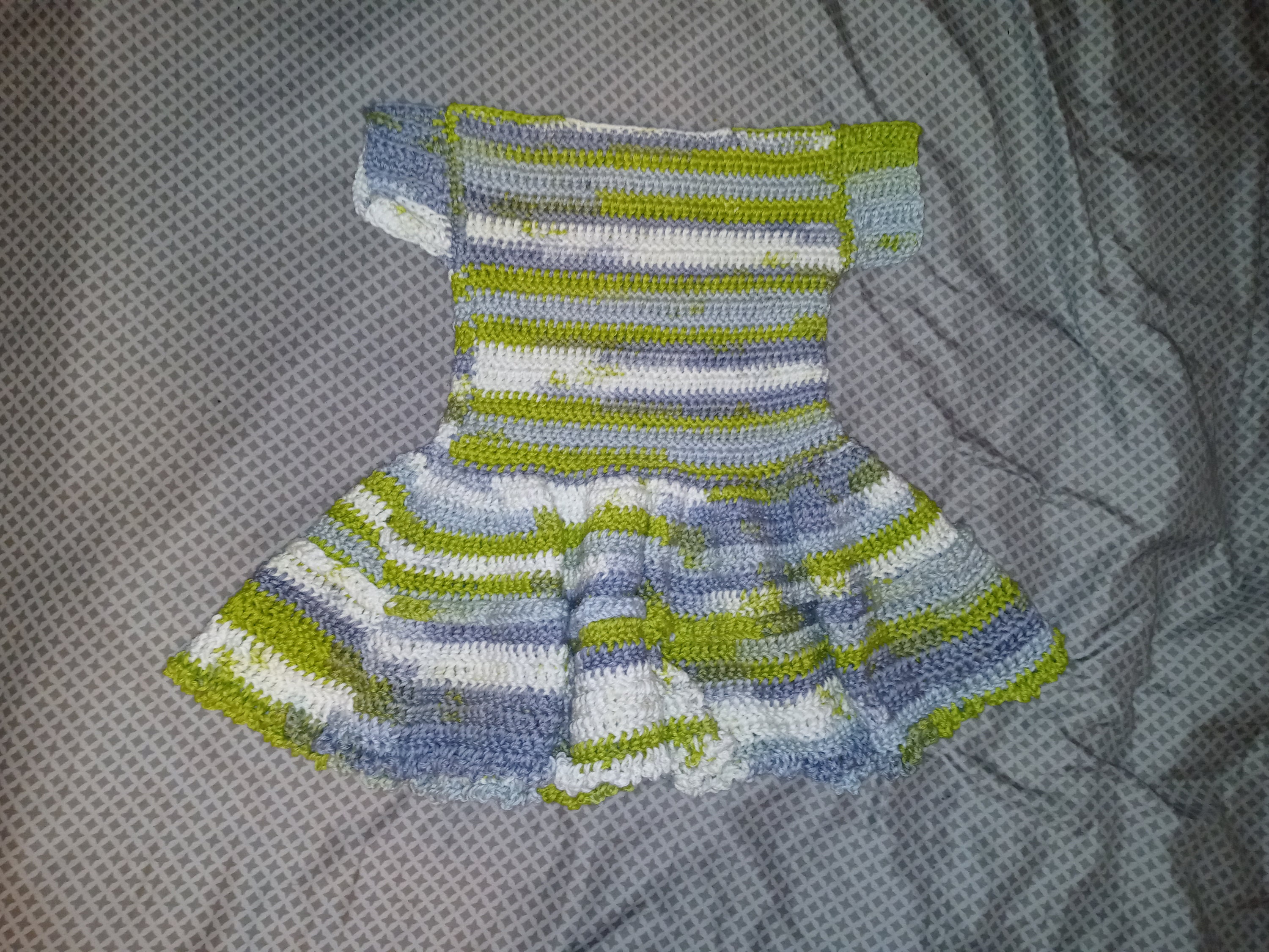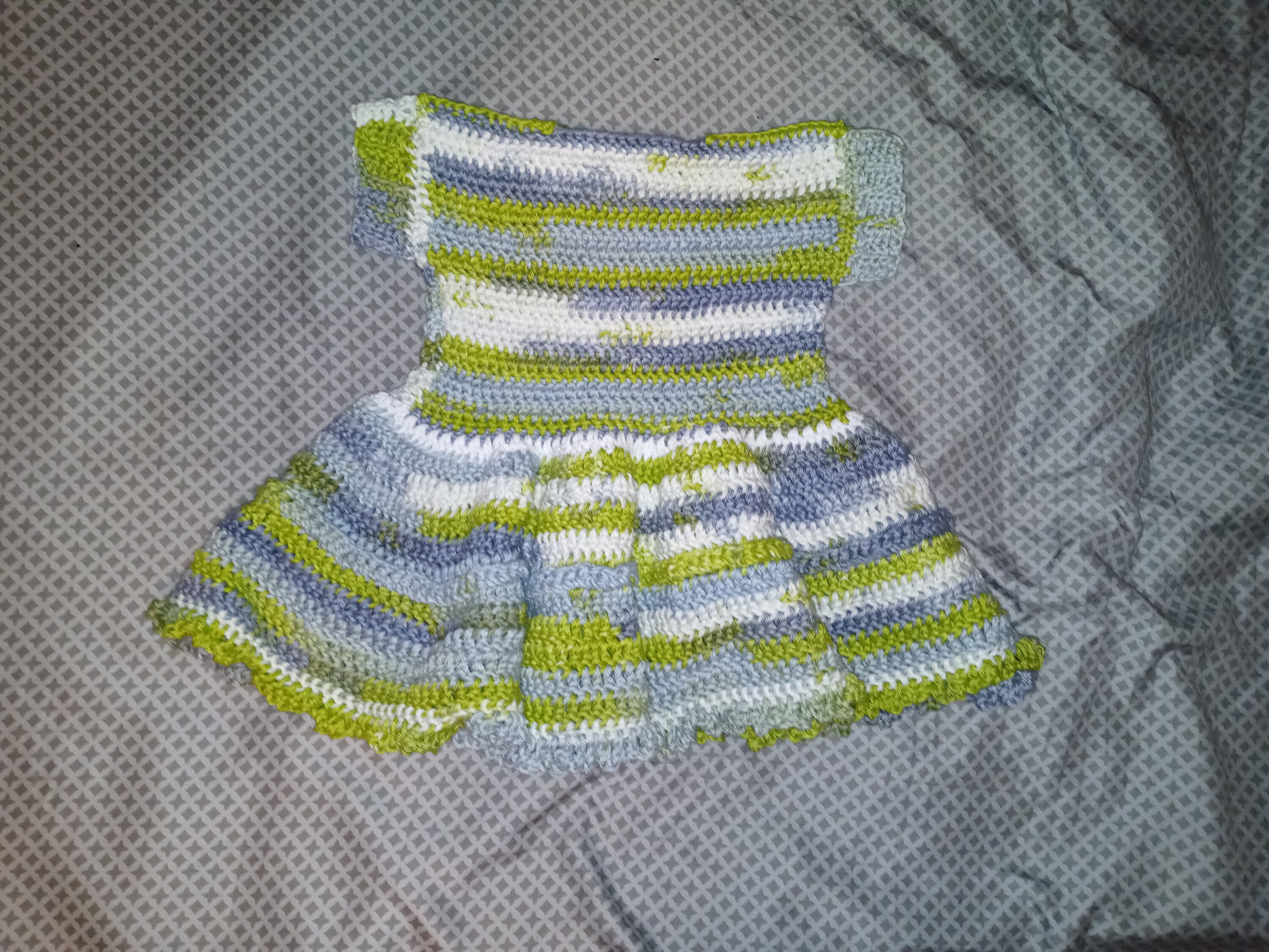 These crochet baby dresses feature small ruffles on the bottom and a braided effect in the middle of the skirt.
